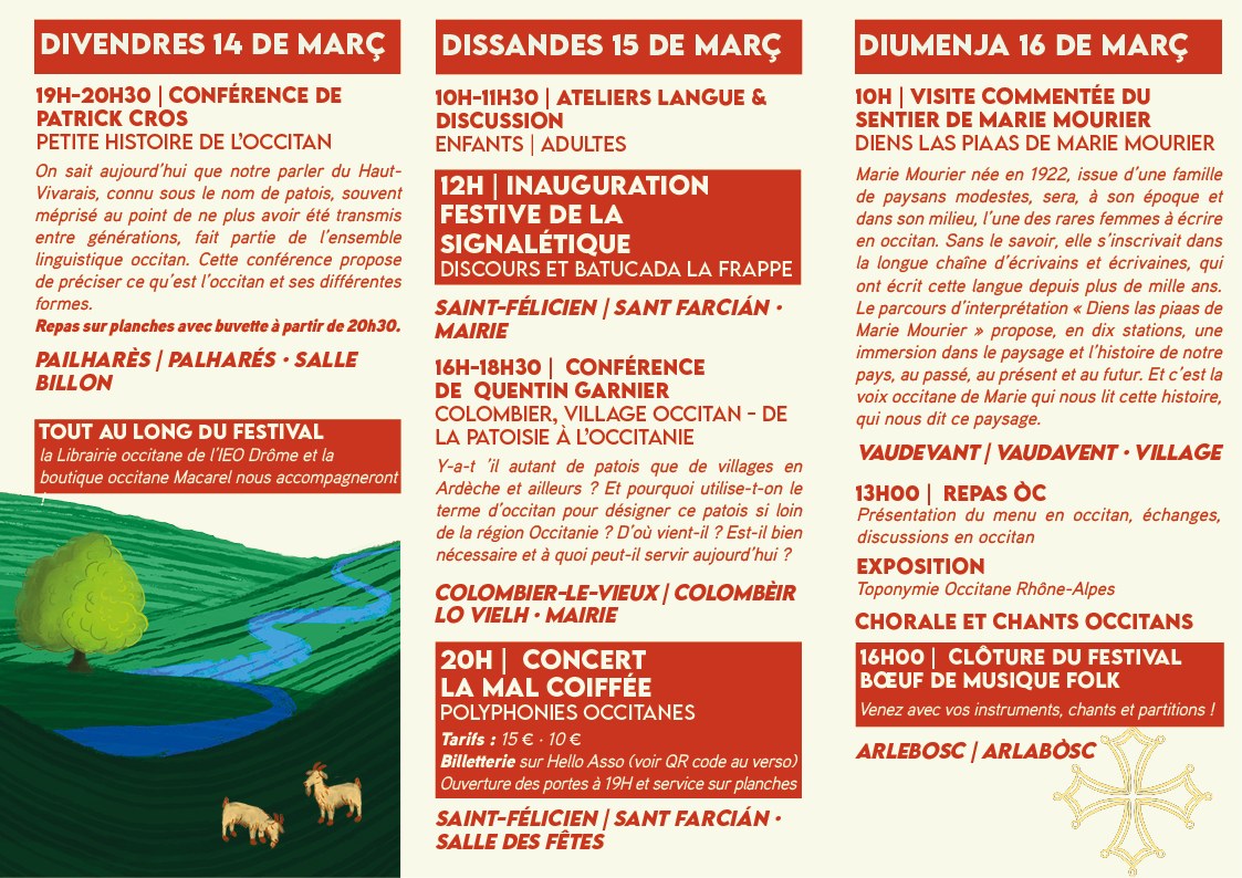 Au programme : une conférence sur l’histoire de l’occitan avec Patrick Cros, l’inauguration festive de la nouvelle signalétique bilingue, un concert du groupe La Mal Coiffée, une visite commentée sur les traces de l’écrivaine Marie Mourier, et bien plus encore. (à découvrir en détail dans l'émission, ou le flyer en image juste en-dessous)